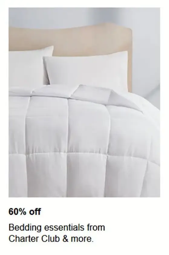 Better hurry! Shop in store and get 60% off bedding essentials from Charter Club & more.